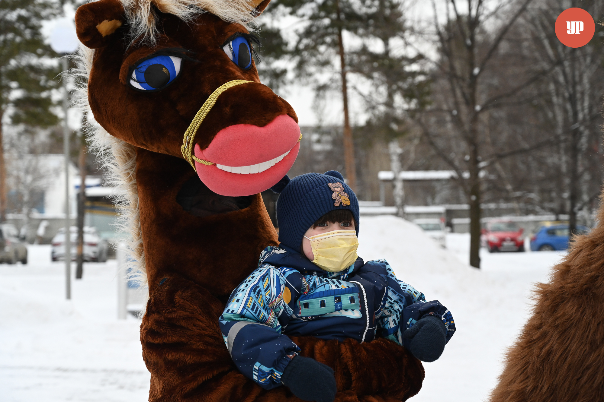 Звучит песня «Три белых коня» из доброго советского фильма «Чародеи». Снеговик с узорчатыми завитками на щеке, конь Юлий из «Трёх богатырей» затейливо отплясывают перед больничным корпусом. Рядом – Дед Мороз, Снегурочка и добродушный медведь. Волонтеры вручают подарки мамам и детям.