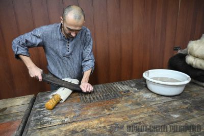И хотя XXI век давно наступил, в мастерской Виталия царит аутентичность. Почти все процессы выполняются вручную. Лишь изредка помогают старые механизмы, которые, кажется, и сами впитали историю, покрывшись трудовыми мозолями. Например, закаточная машина, помогающая подготовить шерсть перед началом работы.