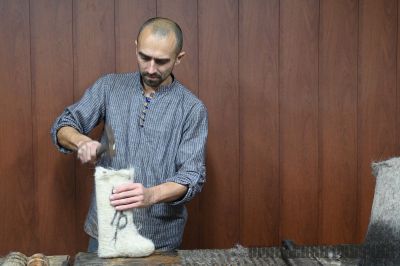 — Я делаю их очень толстыми, — делится он секретом, — кладу шерсть не жалея, уже на первом этапе, когда формирую «закатки полочки» — основания будущего валенка.